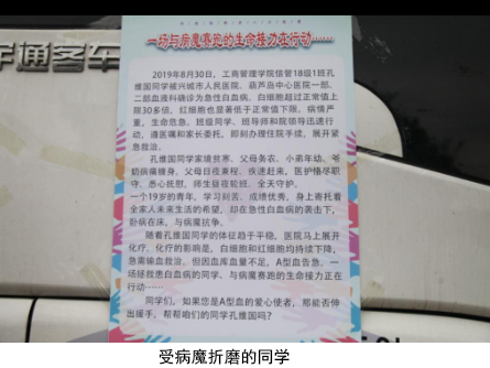 的,之前并不认识这位同学,但是今天早晨看到空间了解到有一位同学患了白血病急需要A型血,我虽然不知道自己是什么血型的,但是还是想尽自己的一点绵薄之力。”
