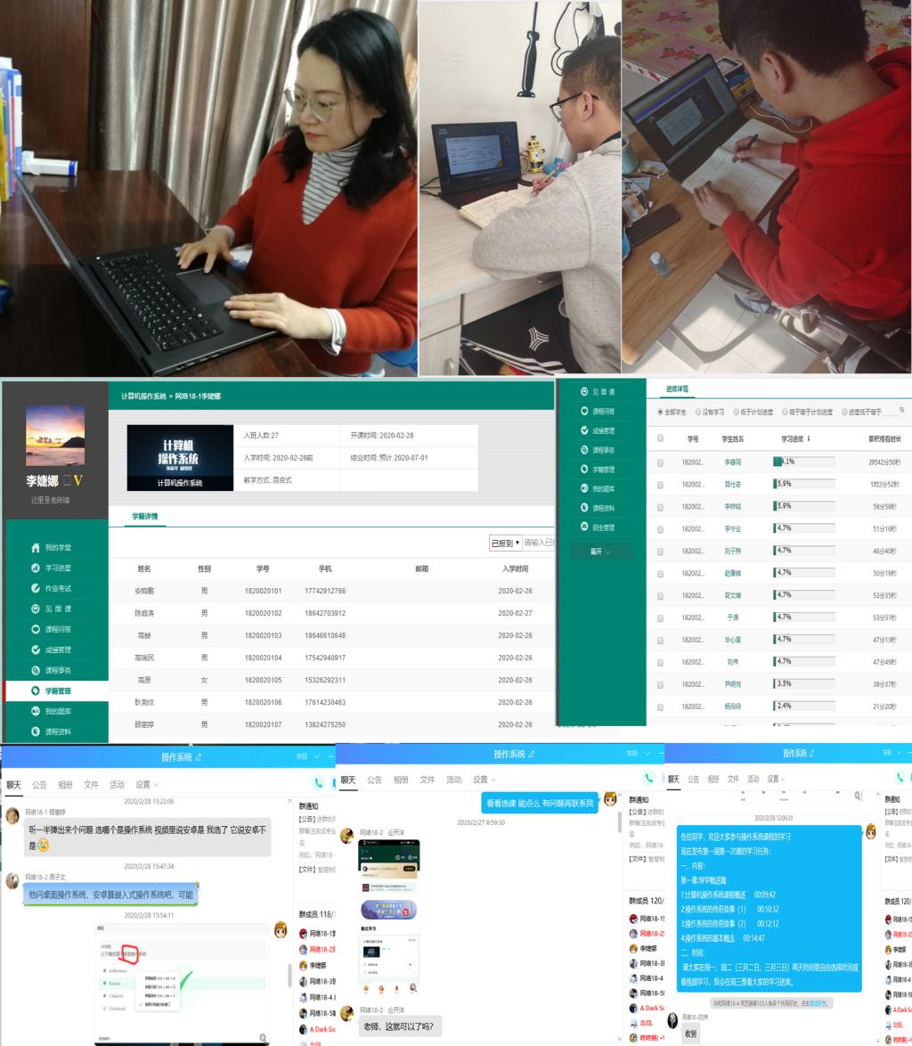用网络代替传统方式授课,难点是调动学生积极性,提升教学效果。我采取提前一天发布本次课程学习任务,学生两天内自由选择时间完成学习,再组织验收;在“进程管理和处理机调度”等重难点章节加入直播互动课;保证QQ学习群的在线时间,及时解答学生疑问,积极参与学生在群内发起的讨论等方式授课。目前授课流程运行顺利,并生成了相关反馈数据,还根据反馈数据及时与学习进度落后的同学沟通,保障了教学质效。