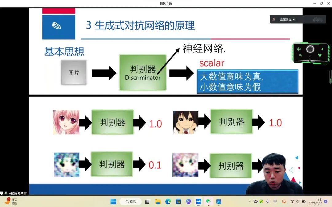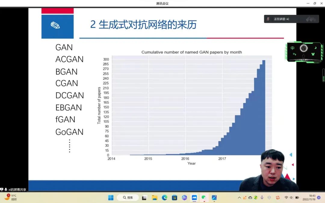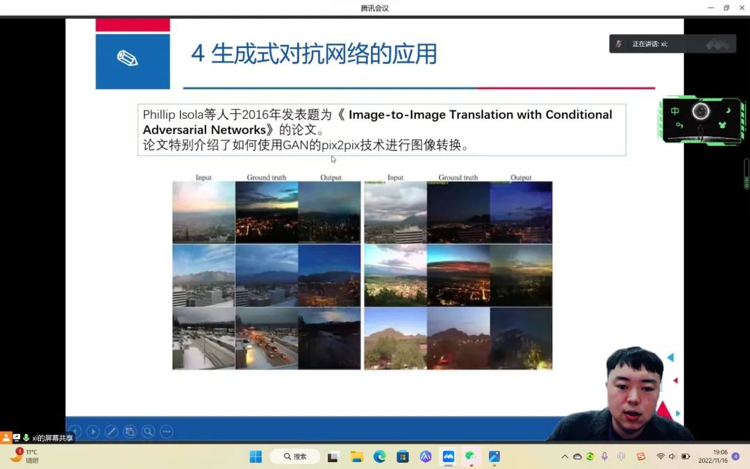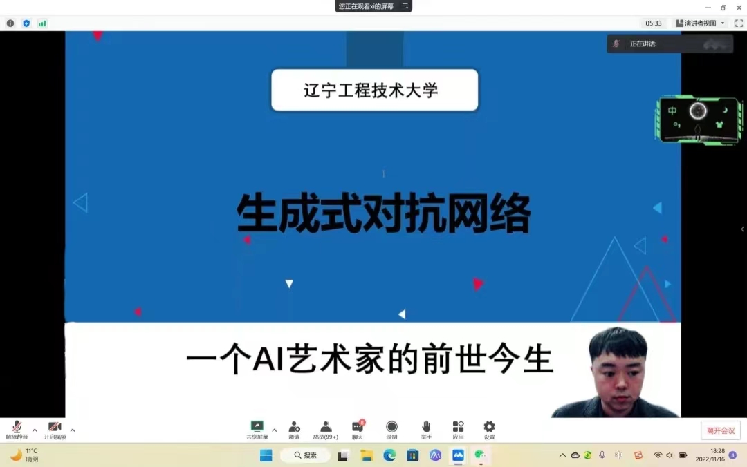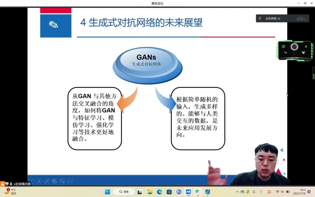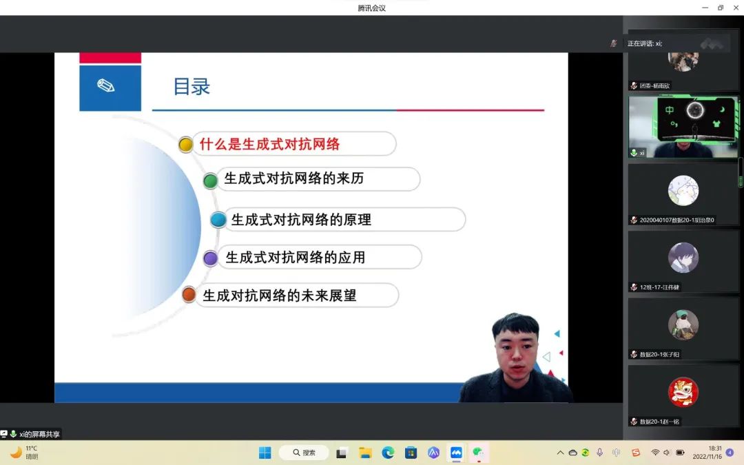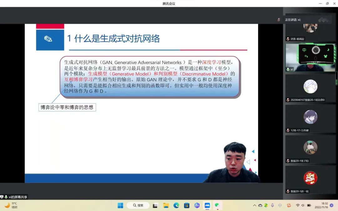 于2022年11月16日晚六点半如期举办题为“生成式对抗网络——AI艺术家的前世今生”的讲座,本次讲座由郗远浩老师主讲,学院200余名学生在腾讯会议上参与了此次讲座。
