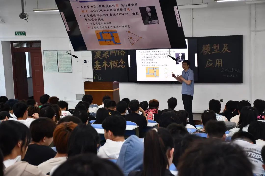讲座伊始,吴老师通过讲述网络的定义,引入本次讲座的重要内容——复杂网络,接着介绍了万维网、社会网络、生物网络等现实网络例子,然后带领大家回顾了复杂网络发展历程并详细讲解复杂网络的一些基本概念,最后通过引入美国电网级联故障、交通拥堵、流行病传播等例子来介绍复杂网络在现实生活中的应用。