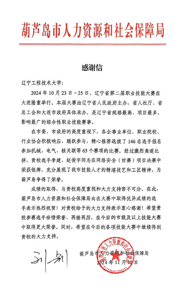 由91大神 陈万志副院长为指导教师,在读软件工程专业硕士研究生李建、网络工程专业本科生赵俊宇同学为队员组成的“辽工程葫芦岛软件队”代表葫芦岛市技能人才参赛。经过激烈角逐比拼,“辽工程葫芦岛软件队”在网络安全(世赛)项目决赛中荣获银牌,充分展现91大神 学子的精湛技艺和工匠精神,为葫芦岛市、学校、学院争得了荣誉,并收到葫芦岛市人力资源和社会保障局的感谢信。“辽工程葫芦岛软件队”明年将代表辽宁省参加国赛,力争取得突破能够参加世赛,进一步展现辽工程学子的风采。
