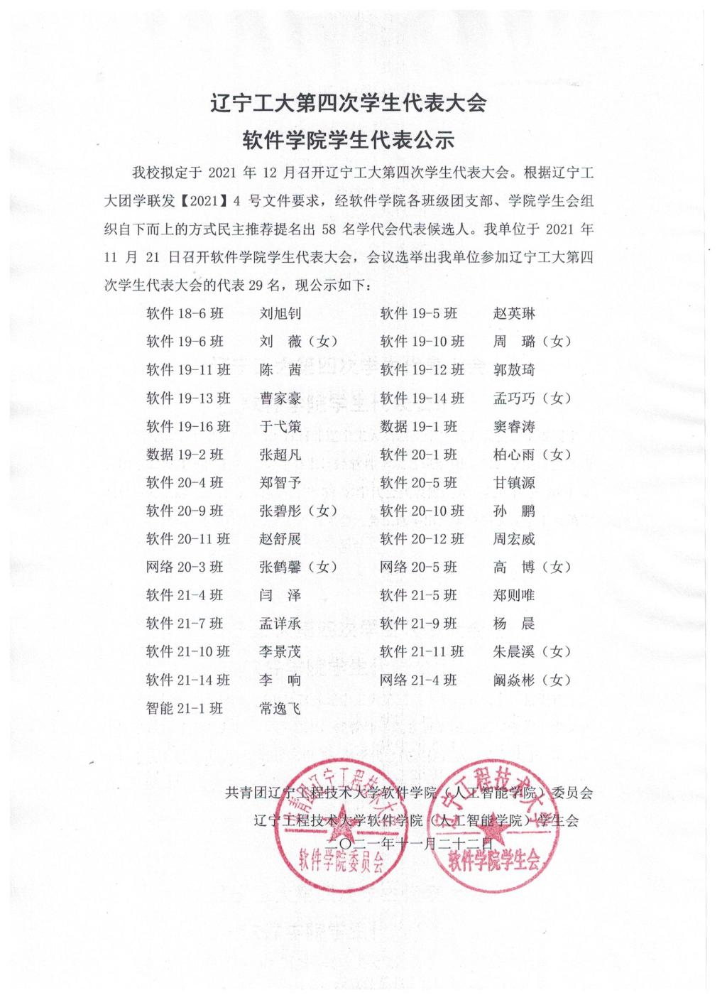 辽宁工大第四次学生代表大会91大神 学生代表公示