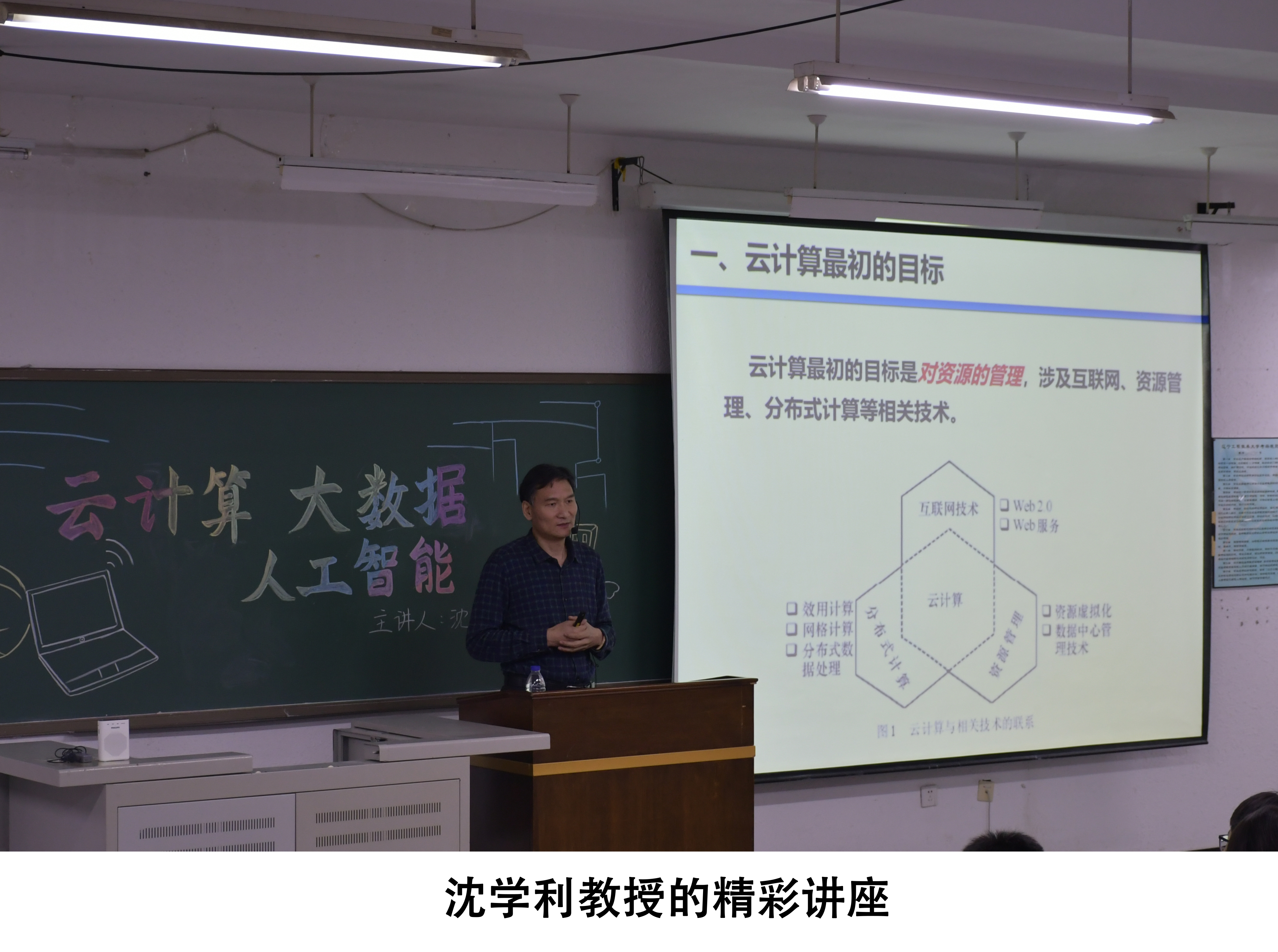 沈教授的讲座从云计算最初的目标、大数据拥抱云计算、人工智能拥抱大数据、基于三者关系的美好生活等四个方面切入,层层深入,从云计算最初的目标开始,详细的讲述了云计算的演变过程,简单介绍了云计算对资源的管理与应用。接着沈教授通过云计算中的短板,引出了大数据的概念,用淘宝的自动推荐功能、音乐软件的推荐歌曲等例子,讲解了大数据的数据类型、功能、作用。最后沈教授播放机器人索菲亚的对话视频,形象地介绍了人工智能的发展和目标,告诉我们一定要对科学感恩,做一个有情怀的人。