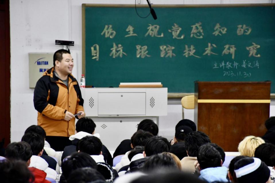 讲座伊始,姜文涛老师从研究背景、科学问题、关键技术及应用前景四个方面对主讲内容进行了简要介绍。接着,姜老师从国内外研究现状及发展趋势入手,引导大家逐步理解目标跟踪技术,并向大家重点阐述软特征方法与视觉量子数学模型。随后,姜老师通过列举领域内的代表性技术方法,介绍其在农业、工业和智慧城市建设等方面发挥的重要作用。最后,姜老师通过短视频让大家详细了解了仿生视觉目标跟踪技术的实际应用效果。此次讲座不仅激发同学们对计算机视觉领域的研究兴趣,还为同学们在接下来的学习中夯实专业知识,灵活运用专业技能奠定了基础。