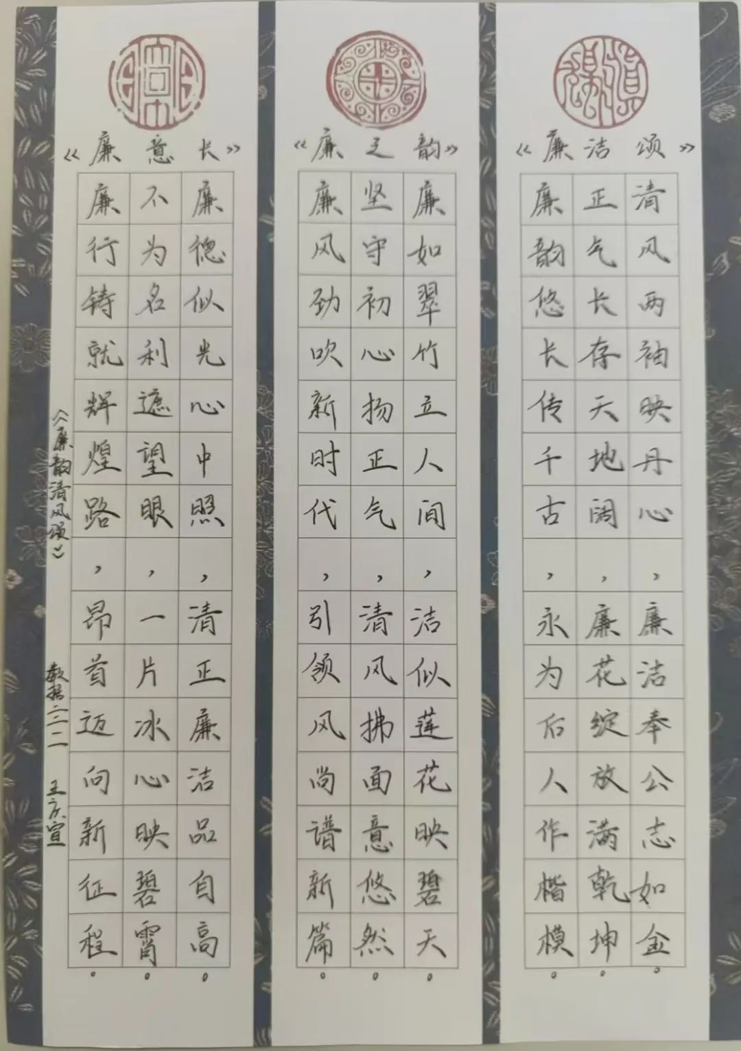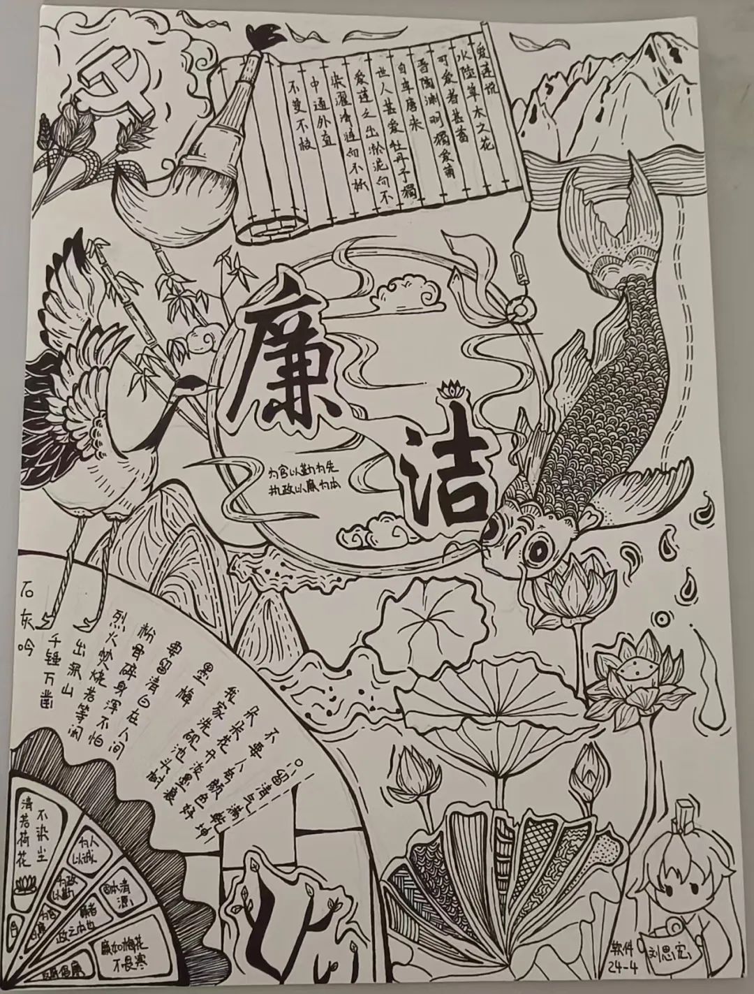 这些作品向大家传递了廉洁理念,弘扬了廉洁精神,营造了良好的“廉文化”氛围,促进师生对清廉文化的认同和践行。以下是部分获奖作品: