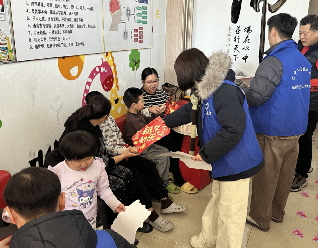 活动伊始,学院“软小蓝”大学生志愿服务团的学生志愿者们与孩子们进行了亲切的交流,并为他们带来了精心准备的零食和水果。同时,同学们组织分发了展示校园风采的风景明信片,生动地向孩子们展示了辽工程美丽的校园景色。志愿者们还赠送了精美的春联和窗花,让孩子们沉浸在浓厚的节日氛围中。活动中,这里的孩子们脸上都洋溢着幸福的笑容。